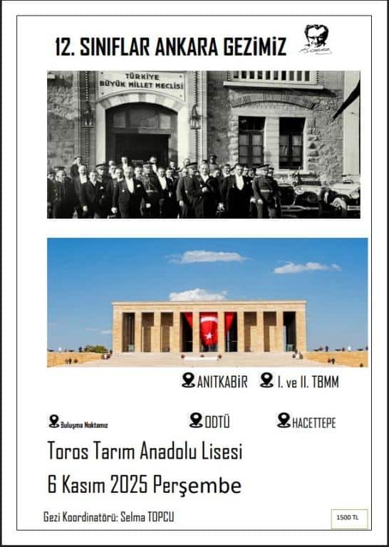 Öğretmenimiz Selma TOPÇU koordinatörlüğünde 12.sınıf öğrencilerin katılabileceği Ankara gezisi 6 Kasım 2025 Perşembe günü yapılacaktır.